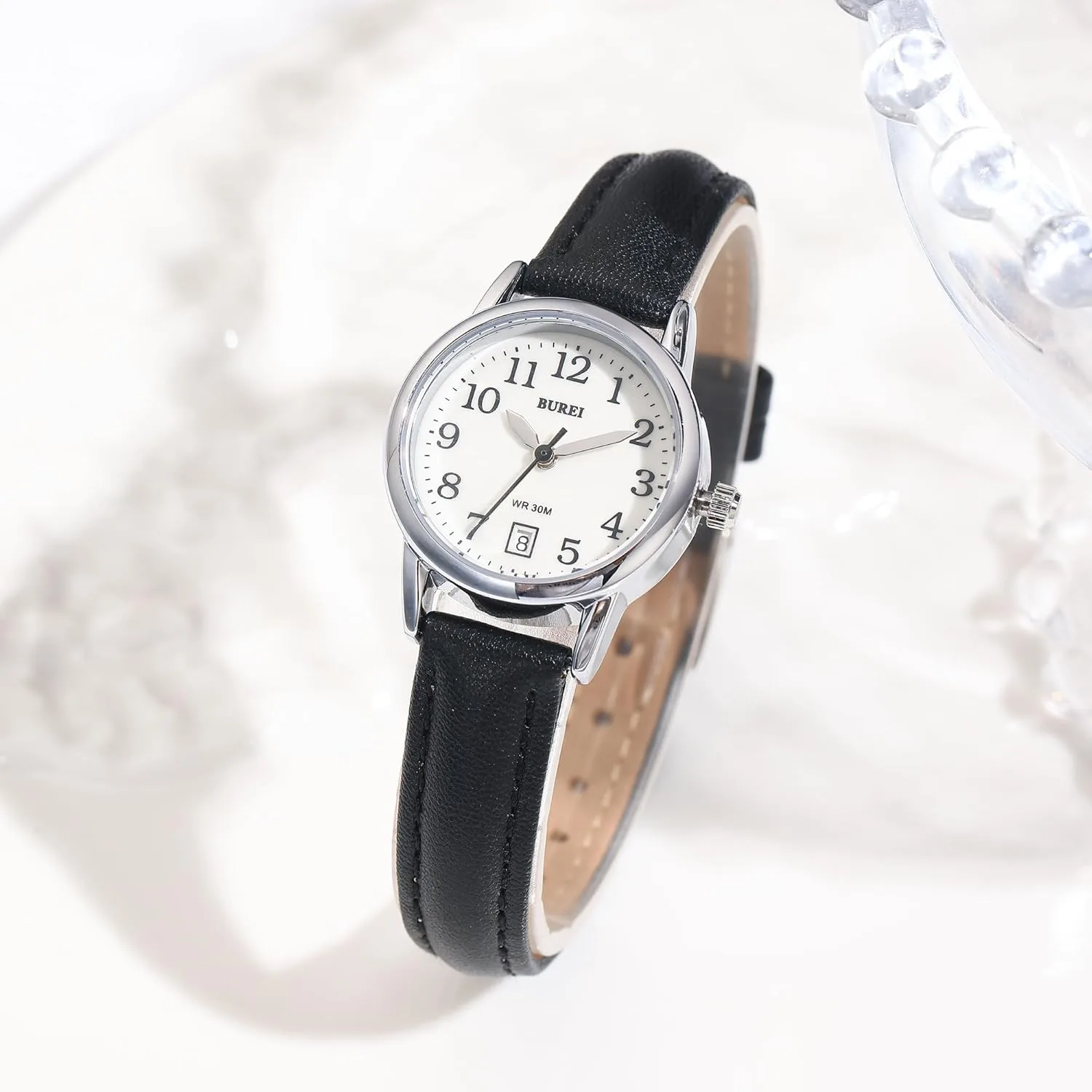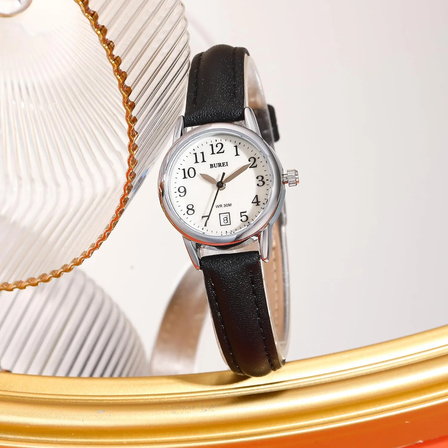 The BUREI Women's Black Leather Watch is a perfect blend of style and function, providing a reliable timekeeping solution for modern women—especially those in demanding professions. This affordable, elegant watch delivers where it counts: precision, comfort, and a classic design that suits every occasion.